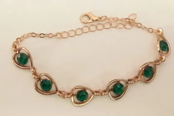 This is a gold-tone bracelet featuring heart-shaped green emerald stones