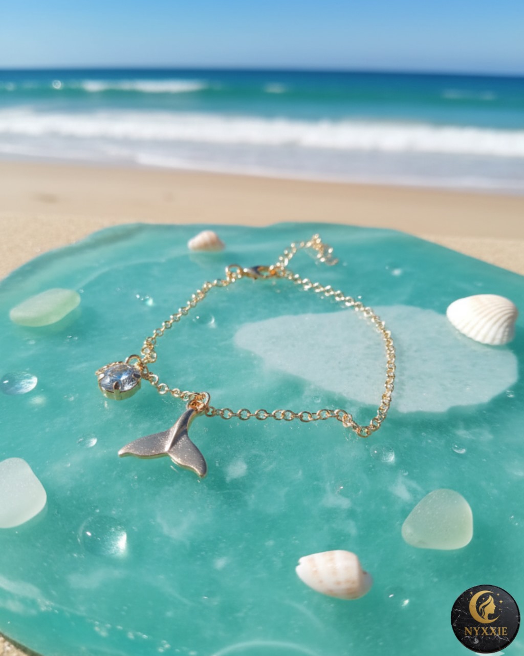 This is a gold-toned whale tail charm bracelet